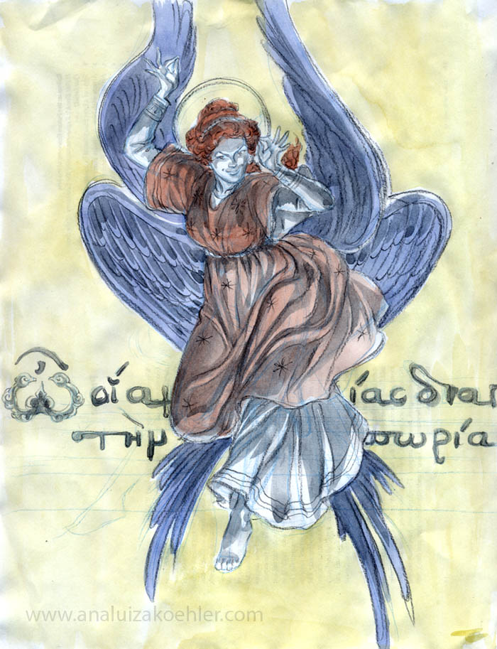 Here’s another icon that, like Gavrilo, is of byzantine inspiration and even depicts a citation of the Sermons of Monk Tiago Kokkinobaphos on the background. Nevertheless, I’m not totally satisfied with this painting. The background inscription couldn’t have been done in a color that is so similar to that of the wings.